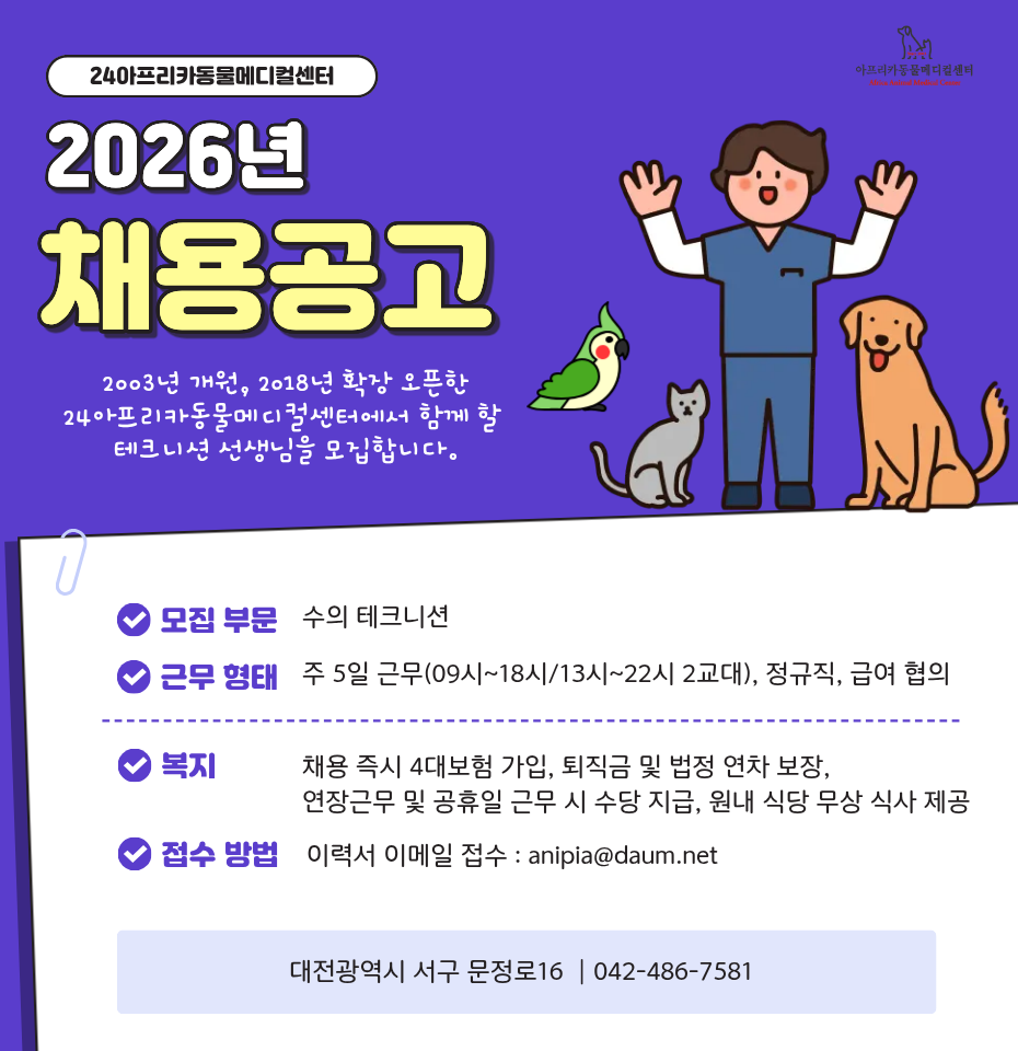 커뮤니티 공지사항 학생활동 취업도우미 포토갤러리 동영상갤러리 관련사이트 동문현황 Home커뮤니티공지사항 공지사항 24아프리카동물메디컬센터 채용공고 카테고리 : | 작성자 : 학과관리자 | 작성일 : 2026.01.09 | 조회수 : 36 첨부파일 [1]24아프리카동물메디컬센터 공고.png 목록 이전글 이전 글이 없습니다. 다음글 2026학년도 동물보건과 수시1차 면접예상질문