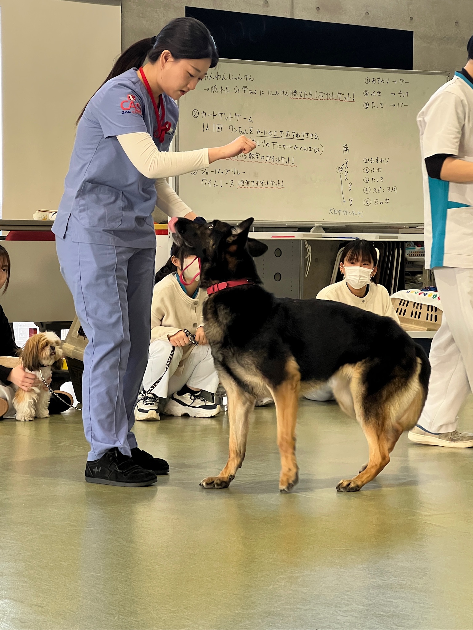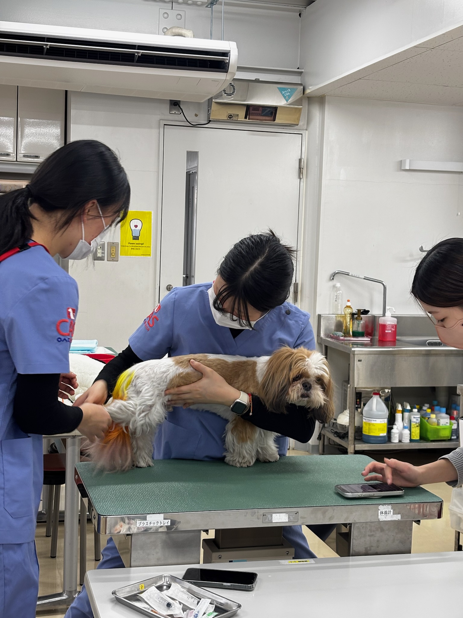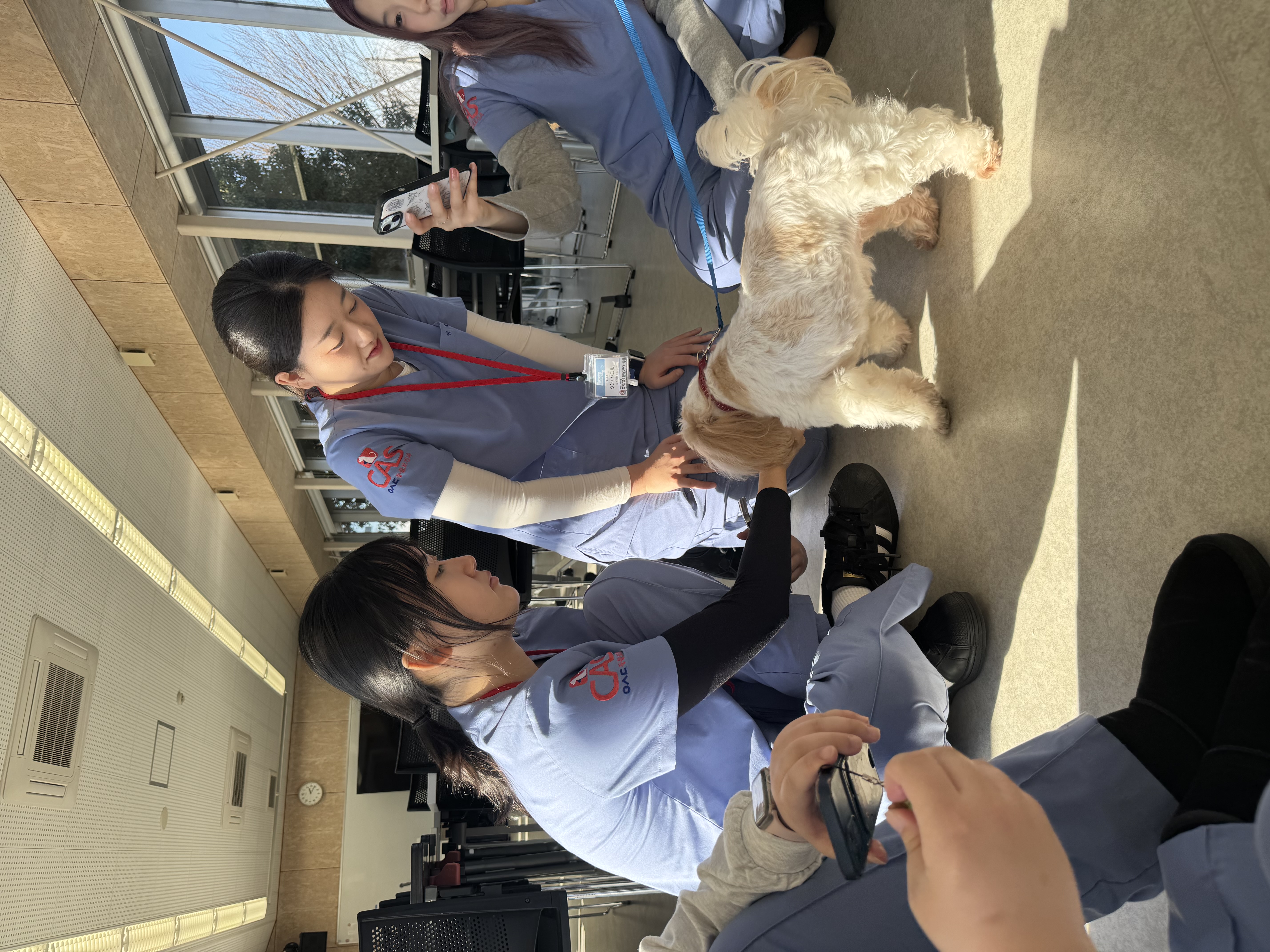 이론 수업으로 심실중격결손증과 패로사증에 대해 학습하며 반려동물의 선천성 심장 질환에 대한 이해를 높였습니다. 이후 DS로 이동하여 독트레이닝 수업을 진행하였으며, ‘앉아’, ‘엎드려’, ‘일어서’, ‘스핀’, ‘8자 사이사이’ 등의 동작을 배우고 일본 학생들과 함께 이를 활용한 게임 활동을 통해 훈련 기법을 실습하며 교류의 시간을 가졌습니다.