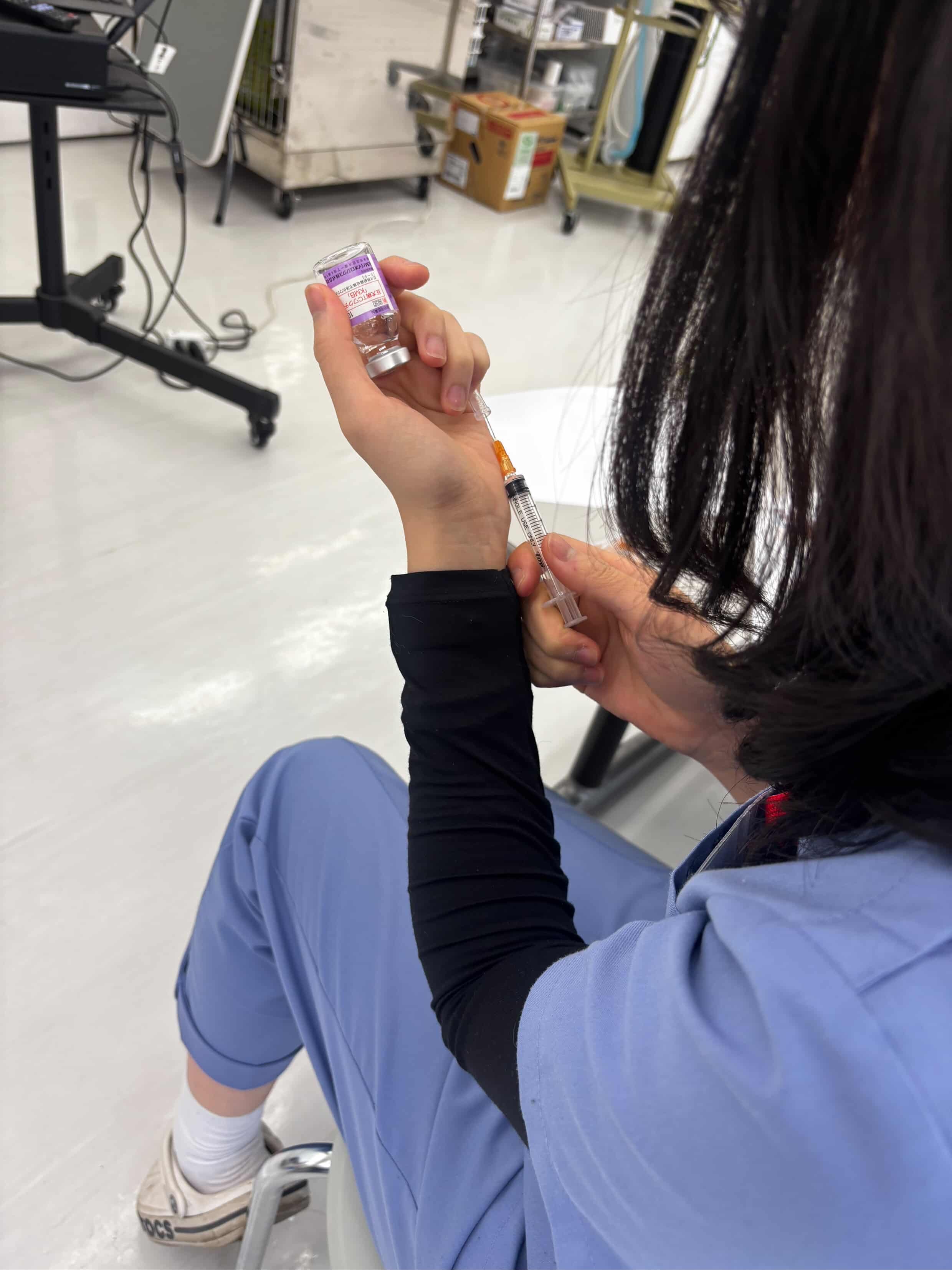 또한 바이알에 담긴 약물을 주사기로 뽑는 방법과 약 먹이는 방법을 실습했습니다.